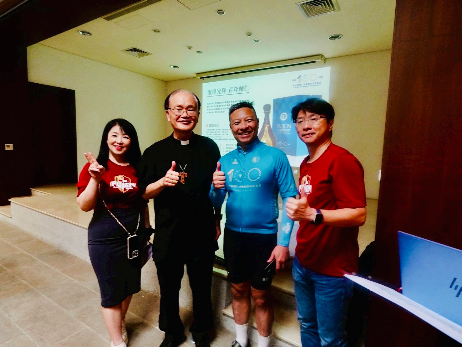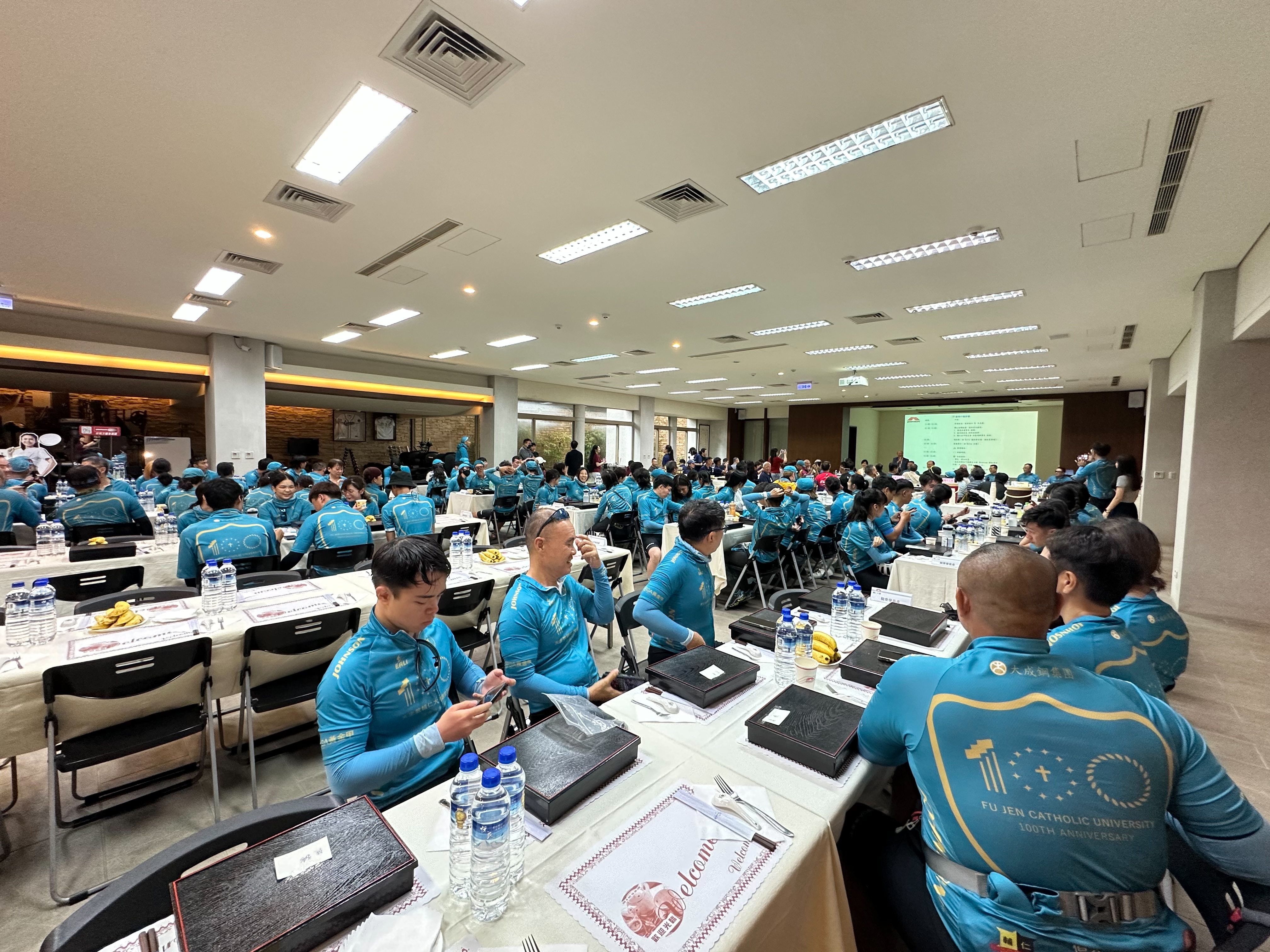 8月4日(一)《百年輔仁·百騎傳承》抵達台中站,受到台中校友們熱情迎接。百人鐵馬車隊在喬山企業總部合影留念,場面壯觀,展現青春與團結的力量。特別感謝台中校友會羅崑泉大學長與夫人多年來持續支持,16年來從未間斷地提供鐵馬隊中繼站,這次一樣慷慨贊助活動經費,讓車隊大力注入前行的力量。羅大學長午餐中並分享自己感人的創業歷程,足成為學弟妹們的榜樣與鼓舞。羅大學長熱情款待鐵馬車隊豐盛午餐、甜點與水果,讓冒雨騎行的夥伴們感受到回家般的溫暖。 台中教區蘇耀文主教也蒞臨現場,為大家帶來會前禱與鼓勵,勉勵車隊勇敢迎接挑戰,並致贈加菜金支持鐵馬。此外,更感謝蘇主教也表達對《聖母光輝 百年輔仁》紀念校酒的支持。
