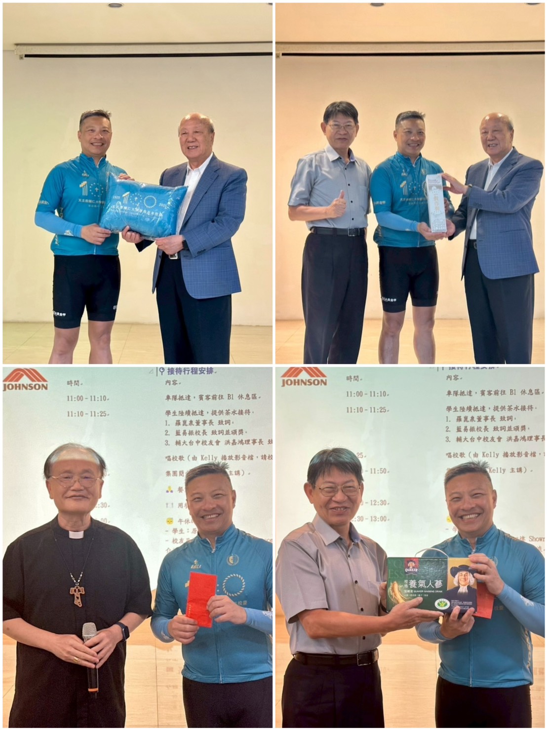▲左上:藍易振校長致贈喬山健康科技羅崑泉董事長百年校慶鐵馬環台車衣,感謝羅學長伉儷長期支持母校發展,每年贊助鐵馬環台車隊活動經費;右上:台中市校友會洪嘉鴻會長致贈羅崑泉董事長紀念酒;左下、右下:台中教區蘇耀文主教、台中市校友會洪嘉鴻會長也響應支持,特別贊助活動經費。
