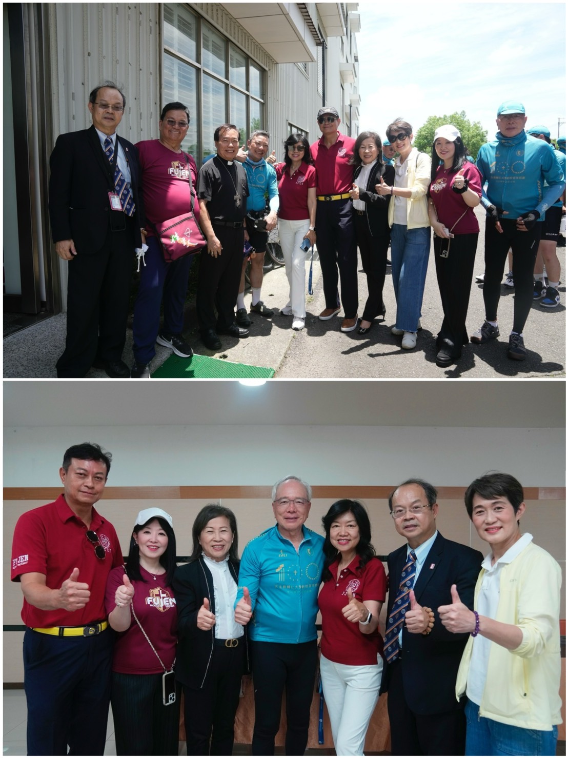 中午時分,車隊抵達大成鋼鐵,受到創辦人──輔大企管系傑出校友謝榮坤學長、台南校友會邱素蘭理事長及多位學長姐們的熱情迎接與細心照料。特別令人感動的是,台南教區黃敏正主教也親臨現場,為鐵馬車隊勉勵打氣,鼓勵大家堅持信念以騎行實踐「真善美聖」的精神旅程。 ▲上圖:台南主教區黃敏正主教,中圖左:大成鋼鐵謝榮坤董事長及全球校友總會鄭時寧總會長;中圖中:校長及謝榮坤董事長;中圖右:校長及贊美酒店黃志佳執行長;下圖左:校長及中華民國校友總會楊明勳理事長;下圖中:台南市校友會邱素蘭理事長;下圖右:校長及織品系友會賴裕綺會長