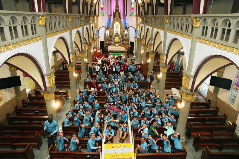 杜勇雄神父接著為鐵馬車隊祈福,而神父宏亮的歌聲,帶來靈性上的平靜與力量,祈願車隊環台的旅程一路順利、平安喜樂。最後,全體車隊在聖殿裡留下壯觀的大合照,象徵輔大百年校慶回到根源的重要紀念,別具意義。