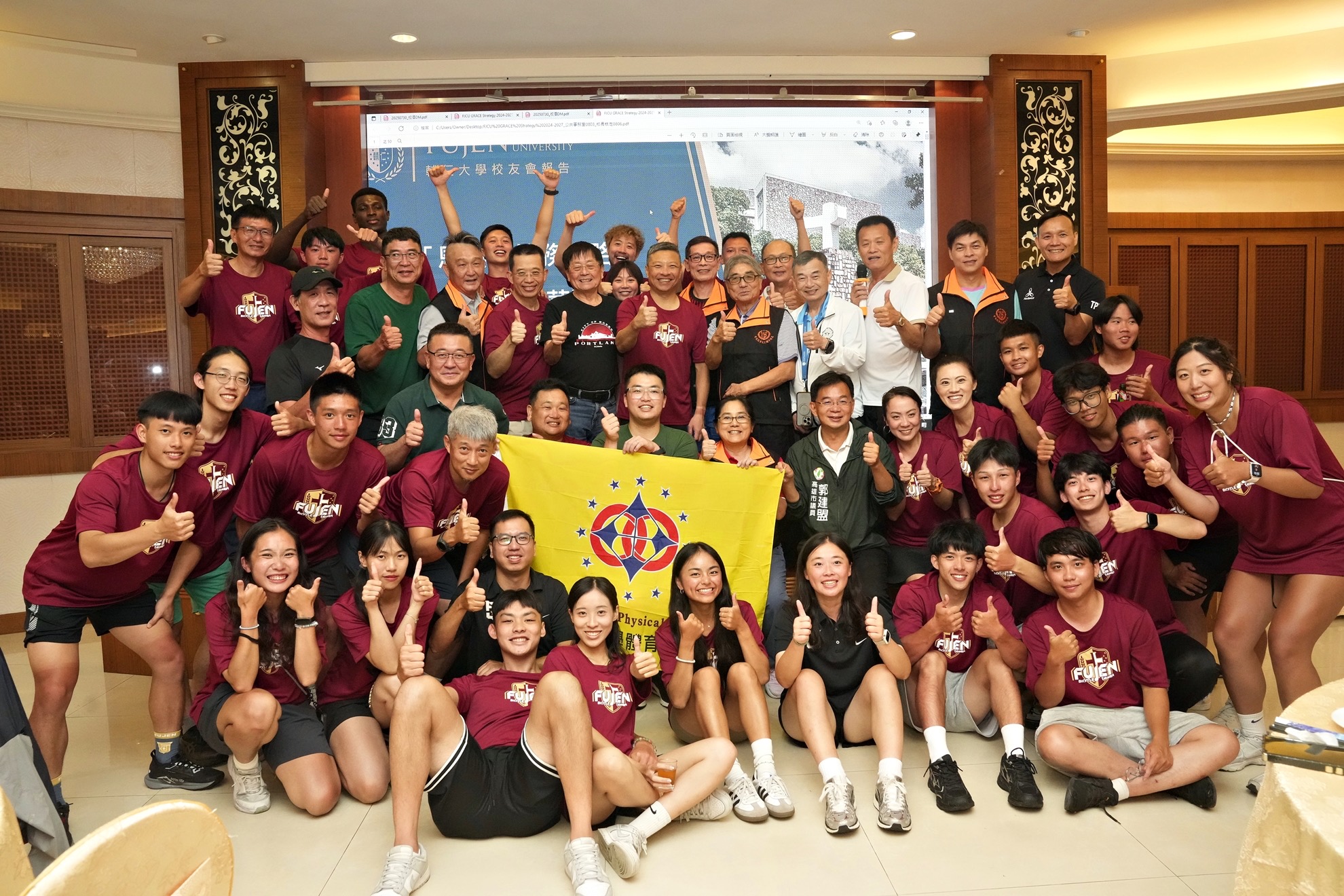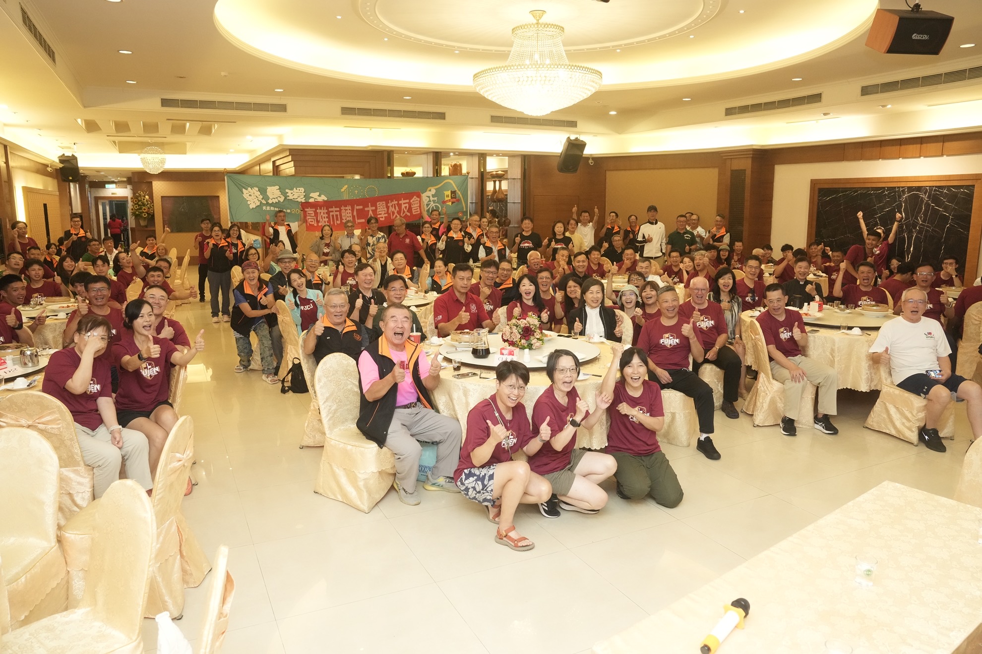 高雄校友會的盛情更像南台灣的太陽;學長姐準備澎湃的海鮮晚宴,讓大家在美味中補充能量,也在歡樂笑聲中感受輔大人世代情誼的溫馨。黃龍學長以中醫師的專業,親手熬煮潤喉茶,立刻成為搶手飲品。高雄校友會前任理事長洪光成學長是現任中華民國校友總會副理事長,他也鼓勵大家堅持不懈,發揮輔大精神繼續面對困難勇往直前。而踴躍出席的體育系校友們也與車隊的學弟妹們合影留念,現場洋溢著歡笑與熱情。