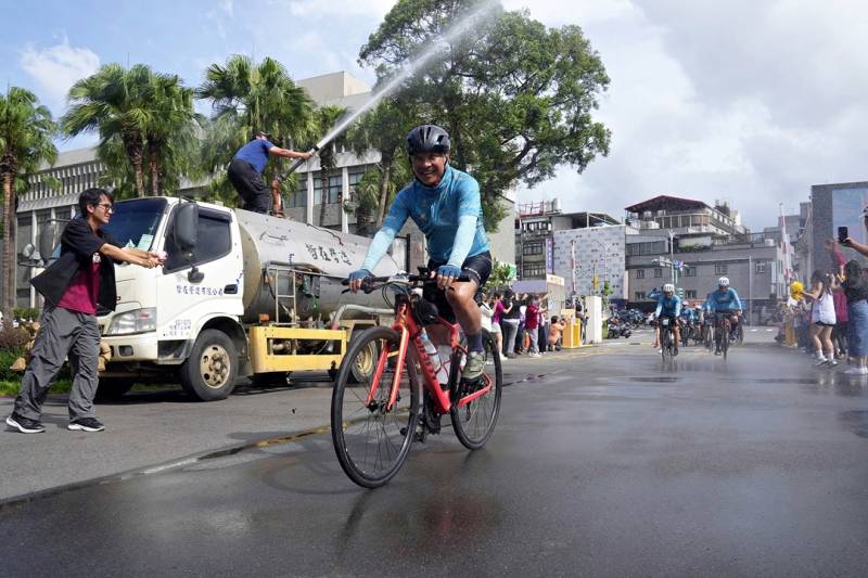 ▲藍易振校長二度率隊騎千里凱旋,新北市議會蔣根煌議長熱情的租來水車「灑水致敬」。